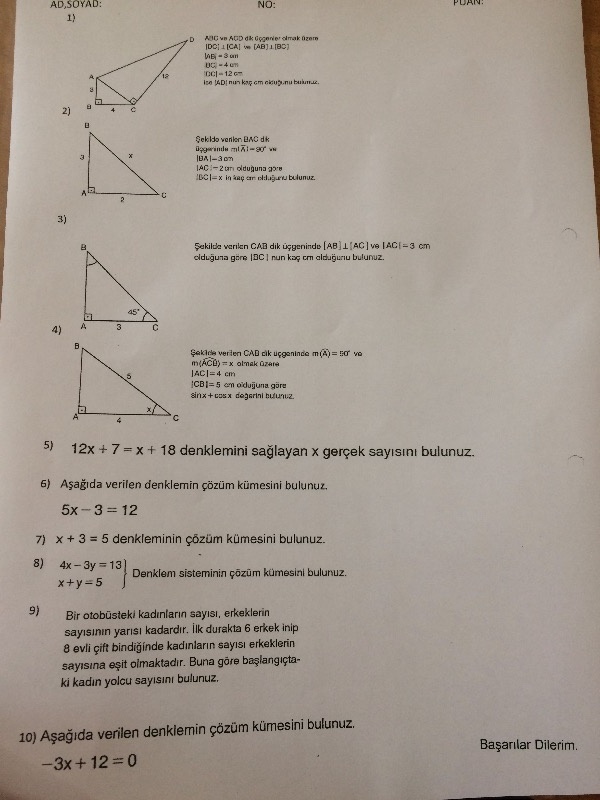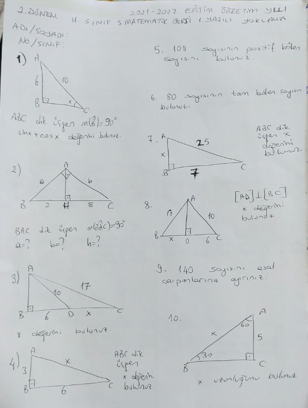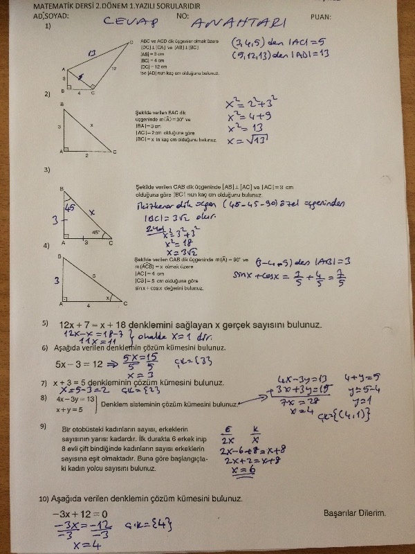 Yazılı soruları Pisagor bağıntısı, özel üçgenler, dar açıların trigonometrik oranları, birinci dereceden bir bilinmeyenli denklemler ve birinci dereceden iki bilinmeyenli denklem sistemlerinin çözüm kümelerinin bulunması, denklem kurarak problem çözme konularından oluşmaktadır.