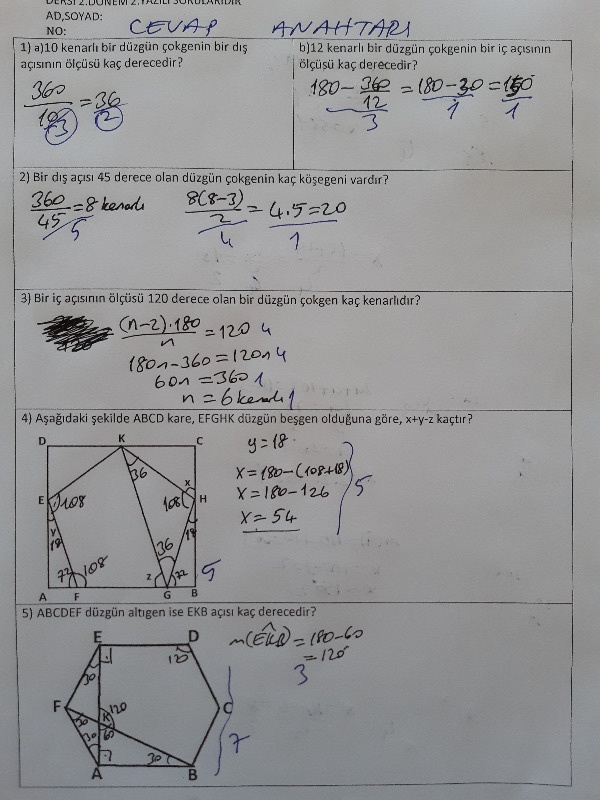 Yazılı kağıdında aşağıdaki konulara yer verilmiştir.1. Düzgün çokgenin bir iç açısının bulunması